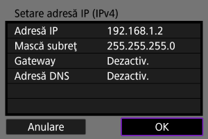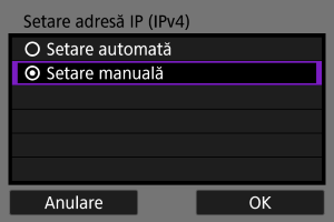 - Dacă aţi selectat [Niciuna], este afişat ecranul [Setare adresă IP (IPv4)] ().
