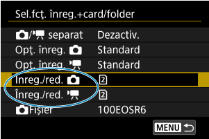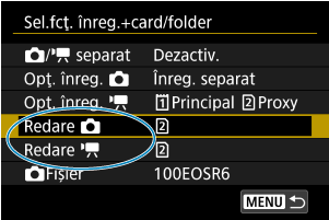 Opţ. înreg.] setat la [Standard]/[Comutarea inreg.], selectaţi cardul pentru înregistrare şi redare.