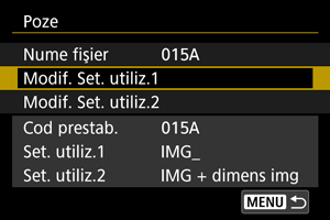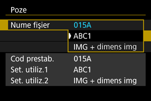 Numele unui fişier are patru caractere alfanumerice urmate de un număr din patru cifre () şi extensia de fişier. Puteţi modifica primele patru caractere alfanumerice, care în mod implicit sunt unice pentru fiecare aparat şi setate când aparatul este livrat.