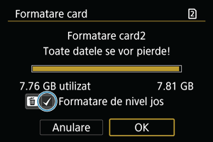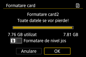 - În timpul formatării de nivel jos, puteţi anula formatarea selectând [Anulare]. Chiar şi în acest caz, formatarea normală va fi realizată şi puteţi prin urmare să folosiţi cardul în mod obişnuit.