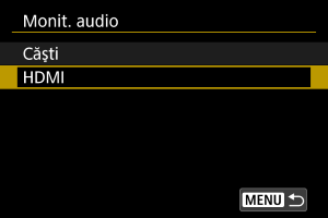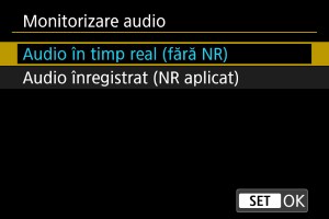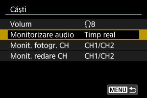 Puteţi alege sunetul din timpul filmării care este folosit pentru a fi transmis în căşti. Pentru a reduce zgomotul în timpul înregistrării audio, configuraţi [Red. zgomot audio] ().