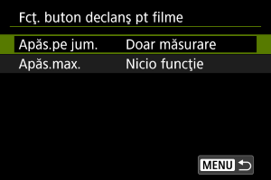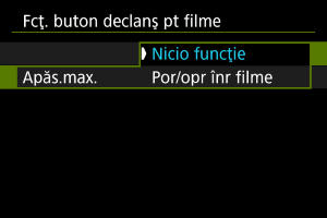 Dacă setaţi [Apăs.max.] la [Por/opr înr filme], puteţi porni/opri filmarea nu doar cu butonul pentru filmare, dar şi dacă apăsaţi butonul declanşator complet sau dacă folosiţi o telecomandă (comercializată separat).