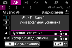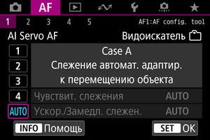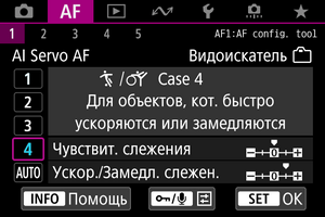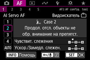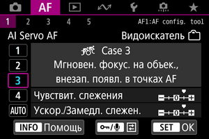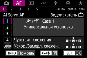 Съемку в режиме AI Servo AF/Servo AF можно легко настроить для конкретных объектов или ситуаций съемки, выбрав вариант Case. Эта функция называется «Инструмент конфигурации автофокусировки»