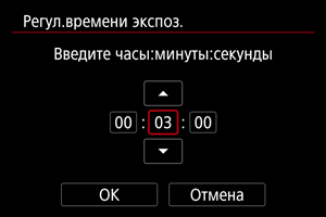 Время экспозиции для съемки с ручной длительной выдержкой можно задать заранее. При использовании этой функции не нужно удерживать кнопку спуска затвора нажатой во время ручной длительной выдержки, что позволяет уменьшить сотрясение камеры.