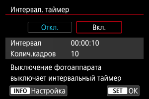 - Съемка с таймером временных интервалов отменяется и сбрасывается на значение [Откл.], если переключатель питания устанавливается в положение