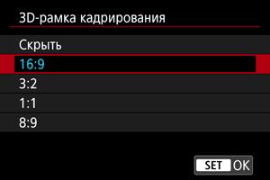 Если планируется кадрировать видеозаписи, снятые с использованием объектива RF-S7.8mm F4 STM DUAL, можно вывести на экран записи видео рамку трехмерного кадрирования (во время ожидания и записи), чтобы понимать конечный угол обзора после монтажа.