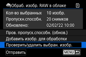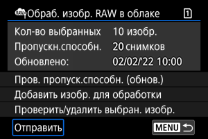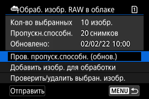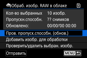 - [Пропускн.способн.] равна [0], если у вас нет платной подписки на облачную обработку изображений RAW. Вы получите информацию о подписке на адрес электронной почты, указанный в учетной записи на image.canon, если будете проверять обрабатывающую способность без подписки.