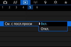 • [Откл.]: при каждом включении камеры просмотр возобновляется с самого последнего снимка.