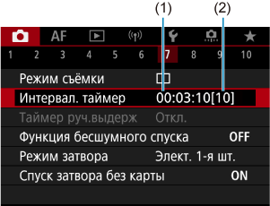 - Съемка с таймером временных интервалов отменяется и сбрасывается на значение [Откл.], если переключатель питания устанавливается в положение