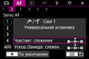 Камера пытается фокусироваться на объект даже в случае перемещения препятствий по точкам AF или выхода объекта из точек AF. При настройке -2 камера дольше отслеживает целевой объект, чем при настройке -1.