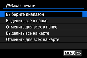 При выборе [Отменить для всех в папке] отменяется заказ печати для всех изображений из данной папки.