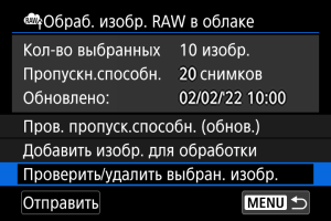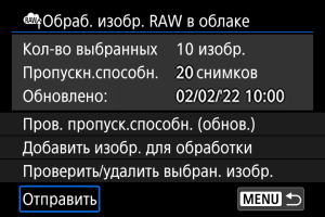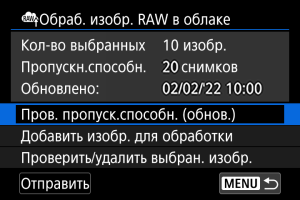 - [Пропускн.способн.] равна [0], если у вас нет платной подписки на облачную обработку изображений RAW. Вы получите информацию о подписке на адрес электронной почты, указанный в учетной записи на image.canon, если будете проверять обрабатывающую способность без подписки.
