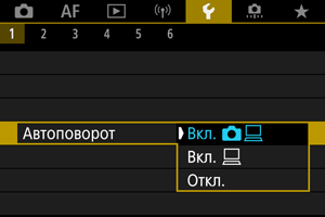 • Изображения, при съемке которых для автоповорота было задано значение [Откл.], не поворачиваются при просмотре, даже если затем задать для автоповорота значение [Вкл.].