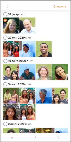 - Для выбора нескольких изображений коснитесь и удерживайте изображение. Первое изображение, которого вы коснулись, становится начальным изображением (начальной точкой), а после выбора последнего изображения (конечной точки) все изображения между начальной и конечной точками отмечаются галочками [
