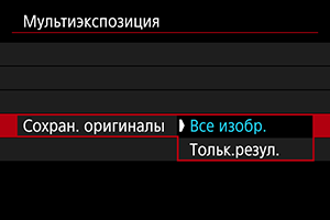 При настройке [Сохран. оригиналы: Все изобр.] сохраняются все одиночные экспозиции и созданное на данный момент изображение с мультиэкспозицией и съемка с мультиэкспозицией завершается. При настройке [Сохран. оригиналы: Тольк.резул.] сохраняется только созданное на данный момент изображение с мультиэкспозицией и съемка с мультиэкспозицией завершается. |
