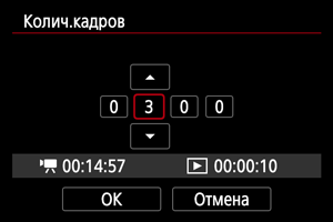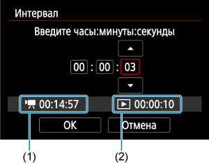 Указывает время, необходимое для съемки заданного числа кадров с заданным интервалом. Если оно превышает 24 часа, отображается значение «*** сут.».