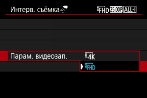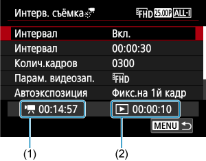Указывает время видеосъемки (время, необходимое для воспроизведения) при создании интервальной видеозаписи 4K или Full HD из фотографий, снятых с заданными интервалами.