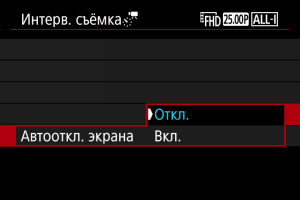 - Даже если для параметра [Автооткл. экрана] задано значение [Откл.], во время съемки экран выключается. Также обратите внимание, что изображения могут не отображаться, если интервал между снимками слишком короткий.