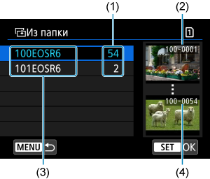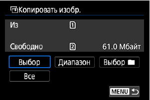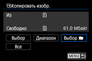 - Вариант [Выбор] не позволяет копировать изображения из нескольких папок одновременно. Выбирайте изображения для копирования из одной папки за раз.