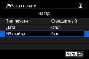 Тип печати Стандартный На листе печатается одно изображение. Индексный На листе печатается несколько уменьшенных эскизов изображений. Оба Печать стандартных и индексных отпечатков. Дата Вкл. При выборе [Вкл.] на снятом изображении печатается записанная на карте дата съемки. Откл. № файла Вкл. При выборе [Вкл.] печатается номер файла. Откл. -