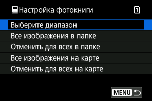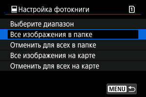 При выборе значения [Все изображения в папке] или [Все изображения на карте] в пункте [Несколько] меню [: Настройка фотокниги] для фотокниги будут указаны все изображения в папке или на карте.