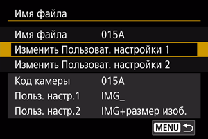 Польз. настр.1 позволяет зарегистрировать ваши собственные четыре символа. Польз. настр.2 добавляет три начальных зарегистрированных символа по вашему выбору к четвертому символу, который обозначает размер изображения и добавляется автоматически после съемки.