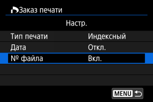 Тип печати Стандартный На листе печатается одно изображение. Индексный На листе печатается несколько уменьшенных эскизов изображений. Оба Печать стандартных и индексных отпечатков. Дата Вкл. При выборе [Вкл.] на снятом изображении печатается записанная на карте дата съемки. Откл. № файла Вкл. При выборе [Вкл.] печатается номер файла. Откл. -