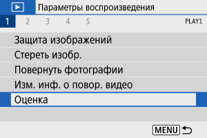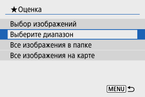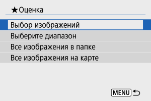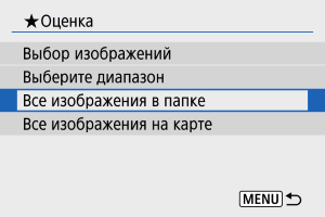: Оценка] выбрать [Все изображения в папке] или [Все изображения на карте], оценка будет задана для всех изображений в папке или на карте памяти.