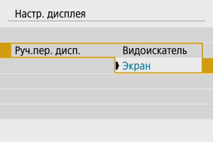 - Когда для параметра [Управл. экраном] задано значение [Авто], для отображения всегда используется экран, но при поднесении видоискателя к глазу производится переключение на видоискатель.
