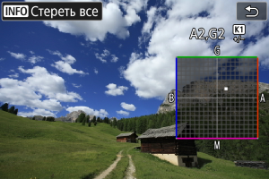 - B обозначает синий цвет, А — янтарный, М — пурпурный и G — зеленый. Баланс белого корректируется в направлении перемещения метки.