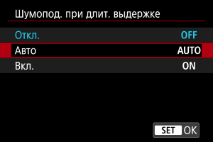 Шумоподавление производится для всех изображений, снимаемых с выдержкой длительностью 1 с и более. Настройка [Вкл.] позволяет уменьшить шум, который не мог быть обнаружен при настройке [Авто].