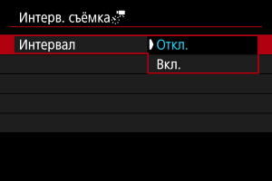 - Чтобы отменить интервальную съемку, задайте для параметра [Интервал] значение [Откл.].