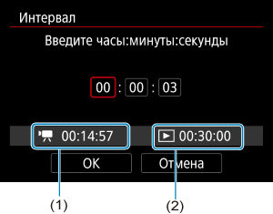 Указывает время, необходимое для съемки заданного числа кадров с заданным интервалом. Если оно превышает 24 часа, отображается значение «*** сут.».