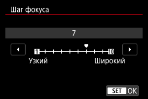 - Подходящие настройки параметра [Шаг фокуса] зависят от объекта. Неподходящая настройка параметра [Шаг фокуса] может приводить к неравномерности объединенных изображений или съемка может занимать больше времени из-за большого количества кадров. Для выбора подходящего значения параметра [Шаг фокуса] выполните пробную съемку.
