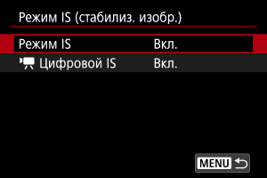 Включает стабилизацию изображений с помощью стабилизатора изображения в объективе. Отображается при использовании объективов со стабилизатором изображения, но без переключателя IS. Не отображается для других объективов.