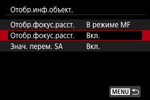 При использовании объективов RF может отображаться расстояние фокусировки. Для индикации расстояния фокусировки можно выбрать момент отображения и единицы измерения.