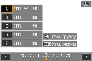 На экране съемки с несколькими беспроводными вспышками можно настраивать параметры для каждой группы вспышек, нажав кнопку, назначенную функции [Быстрое управл. группой вспышек] в пункте [: Польз. настр. кнопок съемки]. В этом примере назначена кнопка