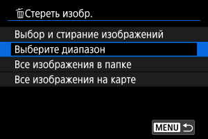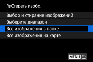 : Стереть изобр.] значения [Все изображения в папке] или [Все изображения на карте] будут удалены все изображения в папке или на карте памяти.