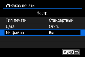 Тип печати Стандартный На листе печатается одно изображение. Индексный На листе печатается несколько уменьшенных эскизов изображений. Оба Печать стандартных и индексных отпечатков. Дата Вкл. При выборе [Вкл.] на снятом изображении печатается записанная на карте дата съемки. Откл. № файла Вкл. При выборе [Вкл.] печатается номер файла. Откл. -