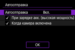 - [При зарядке акк. (высокая мощность)]: автоматическая отправка начинается, когда камера выключена и подключена к источнику питания для зарядки по USB. Обратите внимание, что если исходный уровень заряда аккумулятора был низким, автоматическая отправка начнется только через некоторое время после начала зарядки камеры.