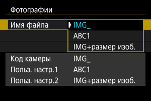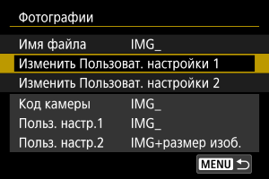 Польз. настр.1 позволяет зарегистрировать ваши собственные четыре символа. Польз. настр.2 добавляет три начальных зарегистрированных символа по вашему выбору к четвертому символу, который обозначает размер изображения и добавляется автоматически после съемки.
