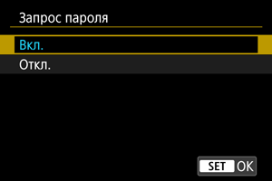 Можно выбрать, требуется ли ввод пароля при установке переключателя питания в положение или при возобновлении работы камеры после автоматического отключения питания.