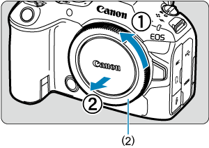 • Снимите заднюю крышку объектива (1) и крышку корпуса камеры (2), повернув их в направлении стрелок, показанных на рисунке.