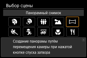 Используйте режим [] (Панорамный снимок) для съемки панорам. Панорама создается путем объединения снимков, сделанных в режиме серийной съемки, когда вы перемещаете камеру в одном направлении при полностью нажатой кнопке спуска затвора.