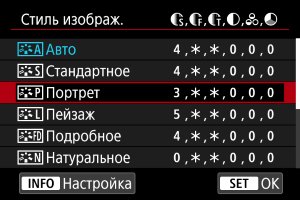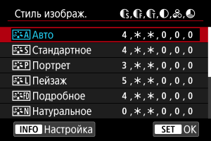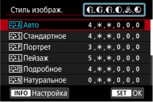 Значки на экране выбора стиля изображения обозначают [Степень], [Четкость] и [Порог. знач.] для настройки [Резкость], а также [Контрастность] и другие параметры. Цифры указывают значения этих параметров для соответствующего стиля изображения.