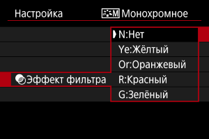 | N:Нет | Обычное черно-белое изображение без эффекта фильтра. |