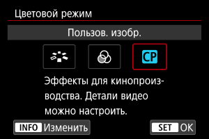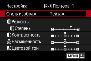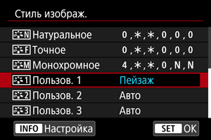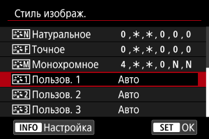 - Для съемки с зарегистрированным стилем изображения выберите зарегистрированный пункт [Пользов. *] и произведите съемку.