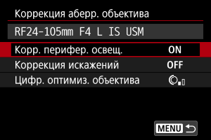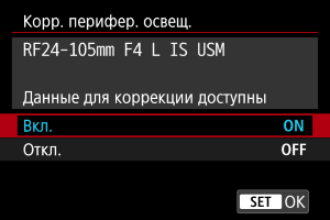 - В случае объективов других производителей (не Canon) для коррекций рекомендуется задавать настройку [Откл.], даже если отображается сообщение [Данные для коррекции доступны].