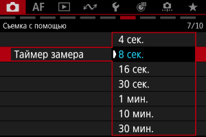Можно задать длительность работы таймера замера экспозиции (который определяет длительность отображения значения экспозиции и фиксации AE) после его запуска, например после нажатия кнопки спуска затвора наполовину.