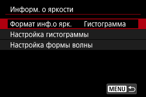 Можно задать формат информации о яркости (гистограмма или монитор формы сигнала), доступной при нажатии кнопки во время ожидания съемки.